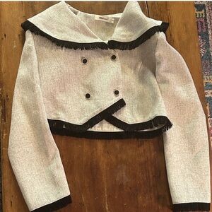 Light textured knit jacket from Korean brand Imimtuan with a wide sailor-style collar and black fringe trim. Double-button front and cropped silhouette give it a retro-inspired look. Great for layering over dresses, skirts, or high-waisted pants.