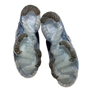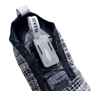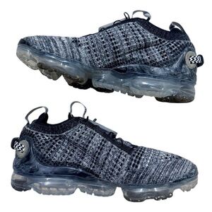 PreOwned in good condition Nike Vapormax FlyKnit GS Sneaker. Normal wear, 7/10 condition, no box, 2020 release, YOUTH, black, white, and grey, flyknit material, clear vapormax bubble sole, laceless, fly ease mechanism, pull heel to tighten, pull loop on tongue to release, unisex, athletic, sporty runners!