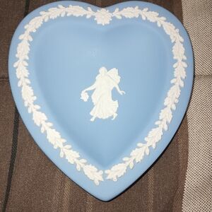 Charming Wedgwood heart-shaped plate in soft blue. Features elegant white detailing. Ideal for enhancing dining decor.