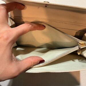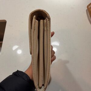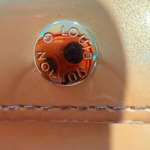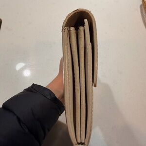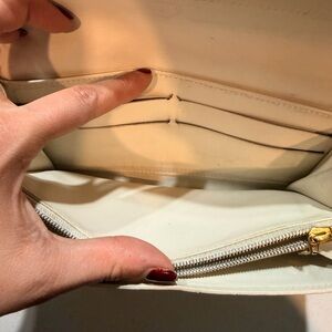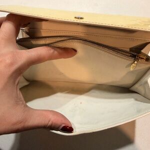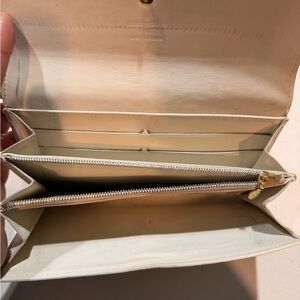 Authentic Louis Vuitton Sarah Wallet in Monogram Vernis embossed patent leather in a light pearl/ivory tone with snap flap closure. A timeless classic LV style with lots of storage.