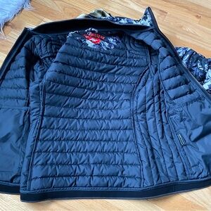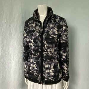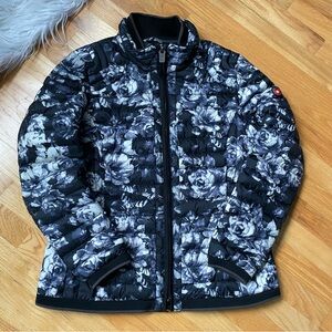 Embrace warmth and elegance with this floral puffer jacket. The black and white design adds a touch of sophistication to your winter wardrobe.