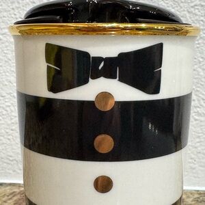 Design: Features a black and white striped "tuxedo" design with gold-colored details and a bow tie.