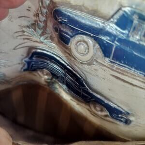 1950’s woody wagon, 1957 Chevy Coupe, surfboard, palm trees