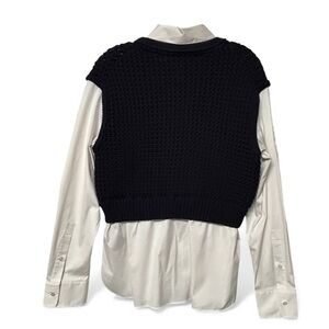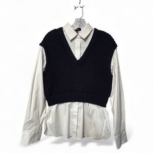 That extra layering piece you didn't know you needed! Theory Woven Rope Vest Combo Poplin Shirt Cotton, Nylon in Navy/White Pre-Styled Dress Shirt with Woven Sweater Vest Spread Collar Long Sleeves with Button Cuffs Decorative Button Placket Relaxed Fit Pullover Style Cropped V-Neck Knitted Vest Hand Wash, Lay Flat to Dry