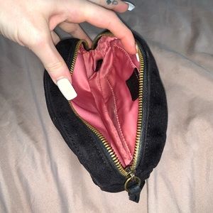 Came with a belt that I no longer have. Been using it as a toiletries/makeup bag for my purse. Exterior velvet is in great condition, interior has some opened seems but nothing too bad that couldn’t be hand sewn.