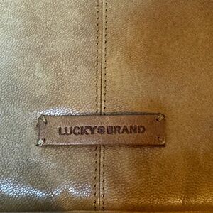 Lucky Brand BoHo Stylish tan leather crossbody bag with intricate stitching. Perfect for everyday use. Tons of storage, glasses / phone pockets /great snaps and zippers for security!