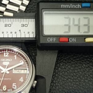This watch has a stainless steel case in great condition with almost no flaws. The face features Silver accents on a Red Face giving an awesome vintage look overall. It also has a date function!
