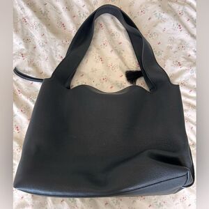 Black leather The Row Duplex bag with gold-tone hardware, dual flat shoulder straps, tonal suede lining, three interior compartments; one with zip closure and concealed magnetic closure at top. Does not included dust bag. Missing tassel, I removed the tassel because it bothered me and I can not find it.