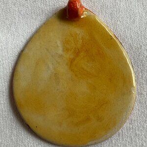Rich orange color with contrasting white daisy glazed on ceramic pendant, quintessential 70's color palette, with avocado green leaves