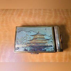 vintage Japanese metal compact case with an attached lipstick holder, likely a souvenir item from the mid-20th century. The artwork on the lid depicts the famous Kinkaku-ji (Golden Pavilion) temple in Kyoto, Japan.