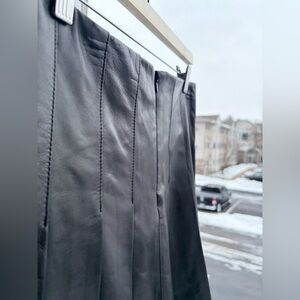 Crafted from 100% real leather, this skirt features structured vertical pleats that create a flattering A-line silhouette. The leather is soft yet substantial, with a beautiful natural grain that reflects the premium quality of the material. Fully lined for comfort and finished with a discreet back zipper.