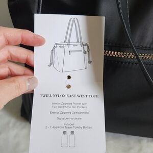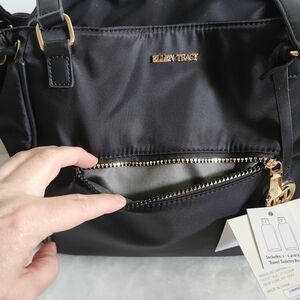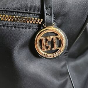 NWT Ellen Tracy Black Gold Twill Nylon East West Tote Shoulder Bag Purse. Go in style with this luxury bag! 2 exterior zippered pockets, gold hardware, detachable signature logo charm, top zip closure, adjustable side straps, gray interior lining, large interior compartment, 2 slip pockets & a zippered pocket, gold metal feet on the bottom, 12" strap drop, approximately 13" x 15" x 5.5". Includes 2 clear plastic travel tolietry bottles. Brand new with tags!