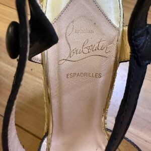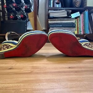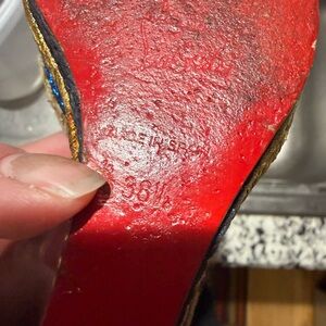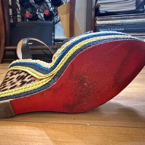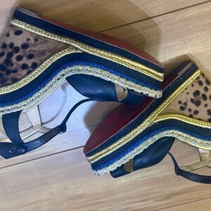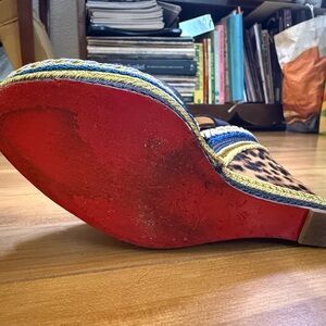 Bold black straps with gold accents. Leopard print wedge with blue and tan details. Perfect for a confident look. Get ‘em! Sizing- if you know you know, but these hold true to what I know about Louboutin sizing: thy say 38.5, but this is truly a US 7.5 (women’s). No box or dust bag, good condition overall.
