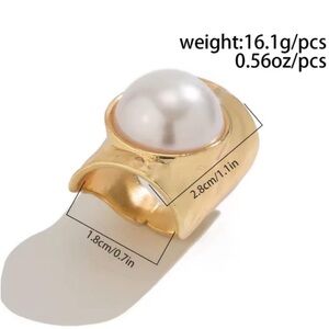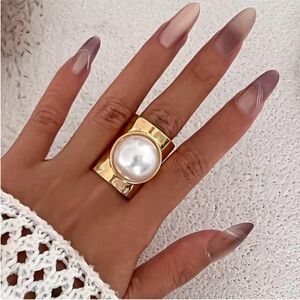 This elegant gold ring features a stunning pearl centerpiece, perfect for adding a touch of sophistication to any outfit.