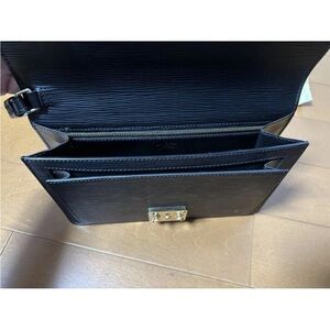 Chic black leather clutch by Louis Vuitton. Features a striking gold clasp. Includes box and dust bag.