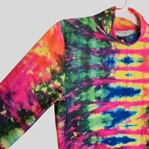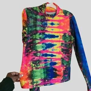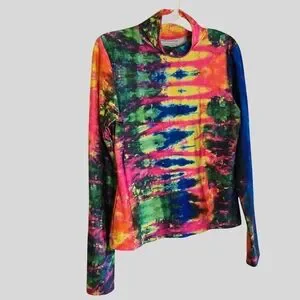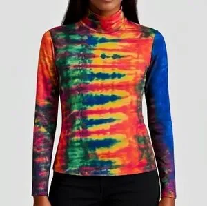 🌈 Design: Allover vibrant tie-dye pattern with a fitted, stretchy turtleneck silhouette — the perfect retro statement piece.