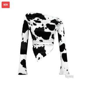 One Shoulder Cow Print Crop Top Long Bell Sleeves Ruched Asymmetrical