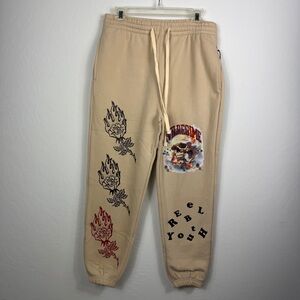 Stylish beige sweatpants featuring a bold skull and flame graphic. Comfortable and trendy.