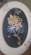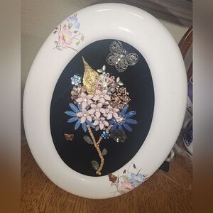 upcycled jewelry oval ceramic table top frame featuring a floral design with pink and blue flowers. Includes a butterfly accent and gold detailing. does not hang on wall.