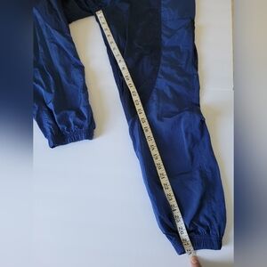 Navy and royal blue jumpsuit with short sleeves. Button-up front and side pockets.