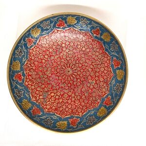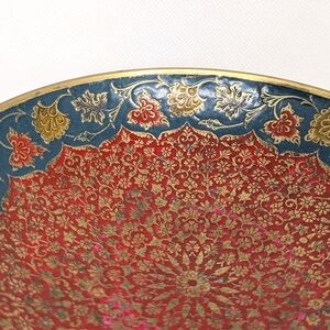Bohemian Solid Brass Bowl Floral Red & Turquoise Blue Enamel Vintage Decor 6.5"