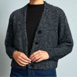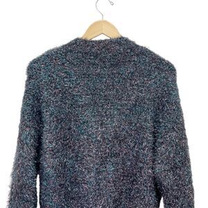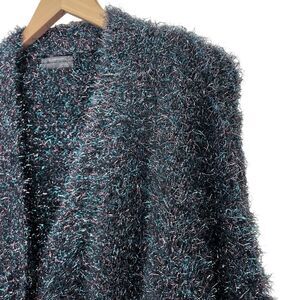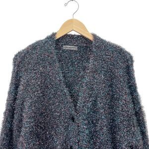 Anthropologie Olivia cardigan in black with metallic blue and pink tinsel shimmer. Soft fuzzy texture and relaxed fit, perfect for festive or chic casual wear.