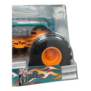 Bring home a bold addition to your Hot Wheels Monster Trucks collection with this Oversized West Coast Crusher. Featuring a vibrant teal and orange design with flame graphics, oversized wheels, and durable metal body construction, this collectible truck is perfect for fans, collectors, or kids who love monster truck action.