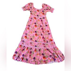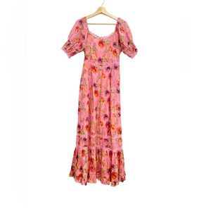 The Marian Maxi Dress by LoveShackFancy features a romantic floral print in wild pink and rose, finished with delicate embroidery and lace trim detailing. Designed with a flattering square neckline, softly puffed short sleeves, and a fitted bodice that flows into a full-length tiered skirt.