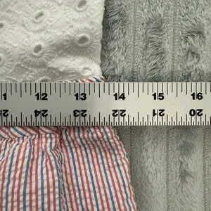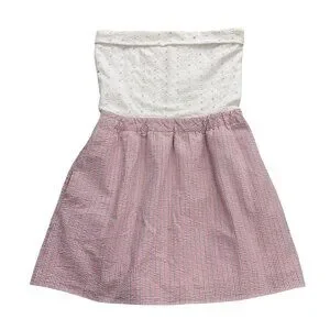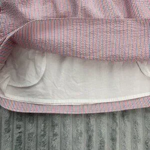 Features a white eyelet bodice and red, white, and blue seersucker striped skirt for a classic, preppy look