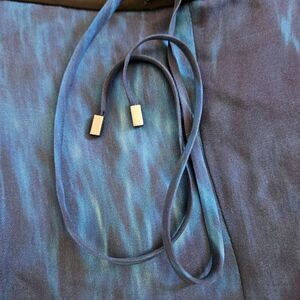 This is a pair of silk pants by Elie Tahari. They're blue marbled with a black elastic waistband and cuff. There is a drawstring with metal embellishments and pockets on each side.
