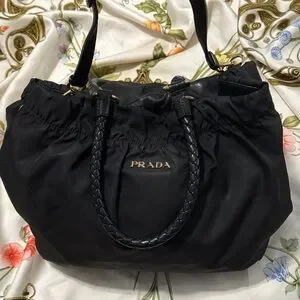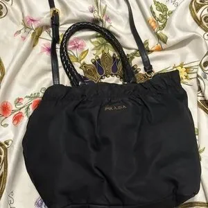 Elegant Prada crossbody bag. Features black exterior. Stylish and versatile. Bow is missing. Interior at bottom of bag does have a tear that someone tried to glue. Not that bad and noticeable . (See pics)