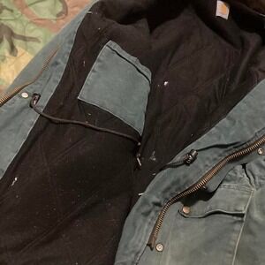 Carhartt turquoise full zip quilted chore coat vintage workwear men's XXL. Tag is chopped but has a 25 inch pit. Black quilted interior with waist pulls. Super beat up look with lots of dirtiness and fading. No rips
