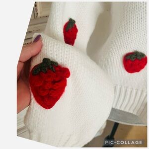 CYGE RED STRAWBERRY APPLIQUÉ CROCHET BUTTON DOWN OVERSIZED CROPPED CARDIGAN