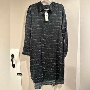 Description: This is a shirtdress with a classic collar and a button front. It features a modern dash print and a high-low shirttail hem.