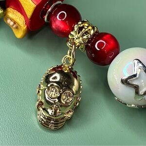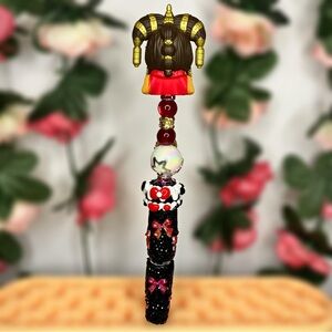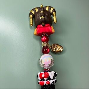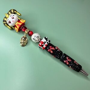 Unique handmade beaded pen with a Star Wars Queen Amidala repurposed Doorable topper. Features red, black, and gold accents. There are small red cat eye beads, a round bead with a star design, and a hand painted bead at the bottom. A gold tone charm of C-3PO also dangles from the pen. The base is covered in black rhinestones and red bow charms. It is a new without tags, handmade beaded pen, but small imperfections may be present. Please see photos for details and approximate measurements. Ink color is black! Ask me any questions!