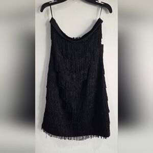 This chic black midi dress from Express features fringe detailing and detachable straps, perfect for evening wear.
