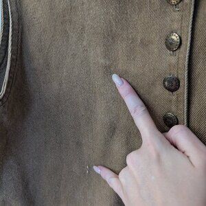 Condition note: Missing top button, shows intentional distressing and fabric variations consistent with age. Some thread pulls and areas of lightening/whiskering add to the vintage appeal.