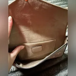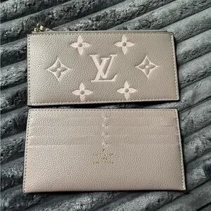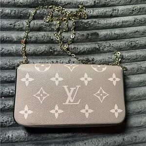 Elegant Louis Vuitton clutch with iconic monogram. Features a gold chain strap. Perfect for any occasion.