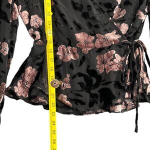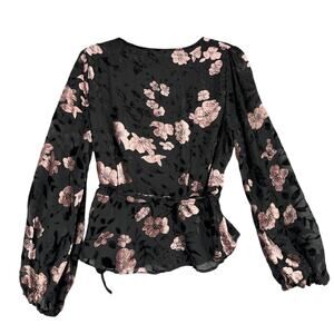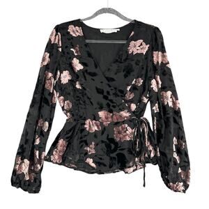 Elegant wrap blouse with floral pattern. Features long sleeves and tie waist. Perfect for any occasion.