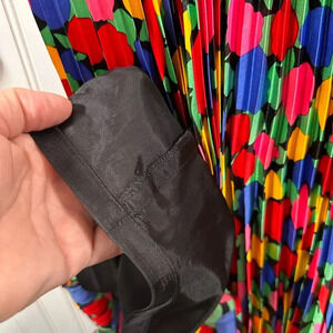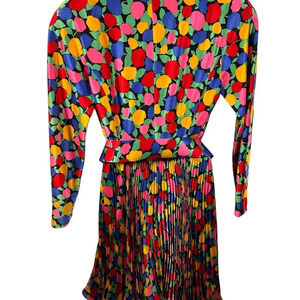 Floral Vintage 100% Belted Silk Dress with pleated skirt lined with shoulder pads. The brand has been cut out. This is a size 4. No noted stains or holes.