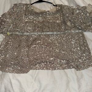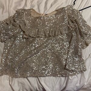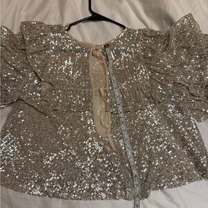 Free People Dance Floor top in size Large. Sequined tiered ruffle style with short sleeves and back tie detail. The sequins have a champagne metallic finish that shifts between gold and silver depending on the light. This shirt is a show stopper.
