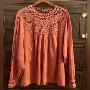 NEW TORRID Boho Cotton Lace Trim Yoke Blouson Sleeve Top in Apricot Brandy 3X