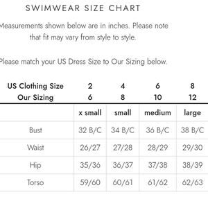 Size: Brand Size 6 (EQUIVALENT TO US SIZE 2 OR EXTRA SMALL) Please see the size chart, I've noticed a lot of these swimsuits mislabeled with their sizing. 6 in the brand sizing is not the same as a US size 6. If you need measurements just ask, I respond very quickly!