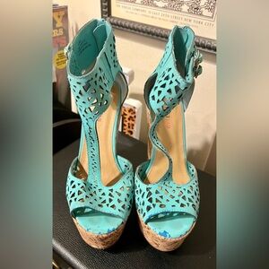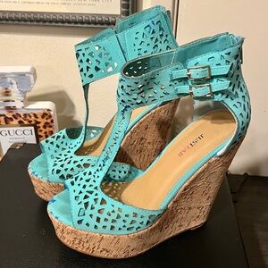 Stylish aqua wedges with cutout design. Features cork platform and double buckle straps.
