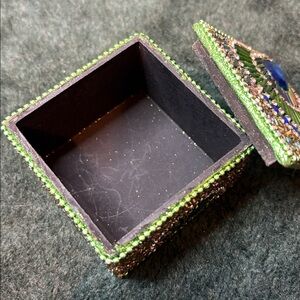 Stunning embellished jewelry or trinket box with green and blue accents. Features intricate beadwork and a large blue faux gem.