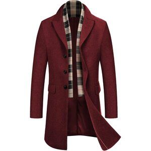 Mens Wine Red Trench Overcoat Wool Blend Coat with Detachable Single Breasted