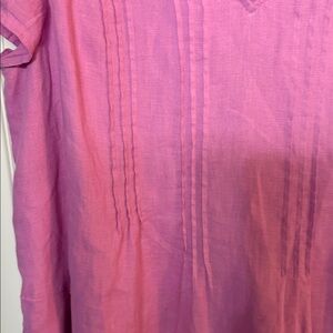 100% linen dress with split neck and pintuck detail on front in a pink/purple lilac color. Short sleeve, pockets, unlined but not see through. Bust is approx 24inches, length is approx 42” inches. Excellent condition.