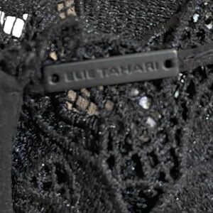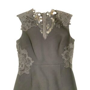 Elie Tahari black lace & crepe body con fitted dress lined. V neck. Back zip. Sleeveless. Made of polyester blend. Euc