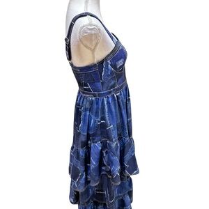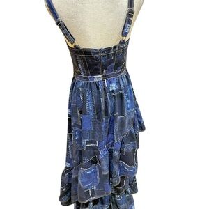 Cinq a Sept Jordyn navy blue patchwork design midi sundress. Ruffle. Bustier. Tiered. Lightweight. Denim look. Flattering midi length. Ideal for stylish outings. Made of 100% polyester. Wore once. Like new.