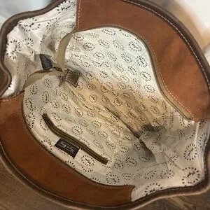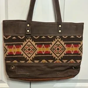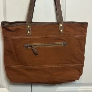 Myra Bag Brick Brown Leather Red Tan Embroidered Cotton Canvas Tote